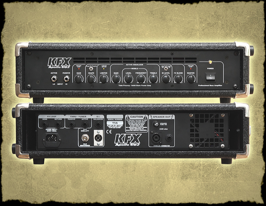 KFX Apollo 602 is powerful tube preamp/MOSFET 600W poweramp bass guitar amplifier. The ECC83S preamp tube gives the amp a vintage warmth and the MOSFET poweramp brings it to the modern era with tons of power. Active and Passive instrument Inputs, the Shape function enhances the sound and character of your instrument, 3 band active EQ with a 200-800Hz parametric Mid control and +/-15dB on each EQ pot. FX loop with a blending pot, Mute/Play switch for tuning, fet Compressor/Limiter in the preamp section, FX blend control, D.I. level control, Pre/Post eq DI selection, clip and compression activity LEDs. All the tweeks and power to please a modern bass player.